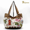 Die Tasche wurde aus verstärktem Canvas mit Blumenornamenten und Kunstleder bronzefarbig gefertigt.